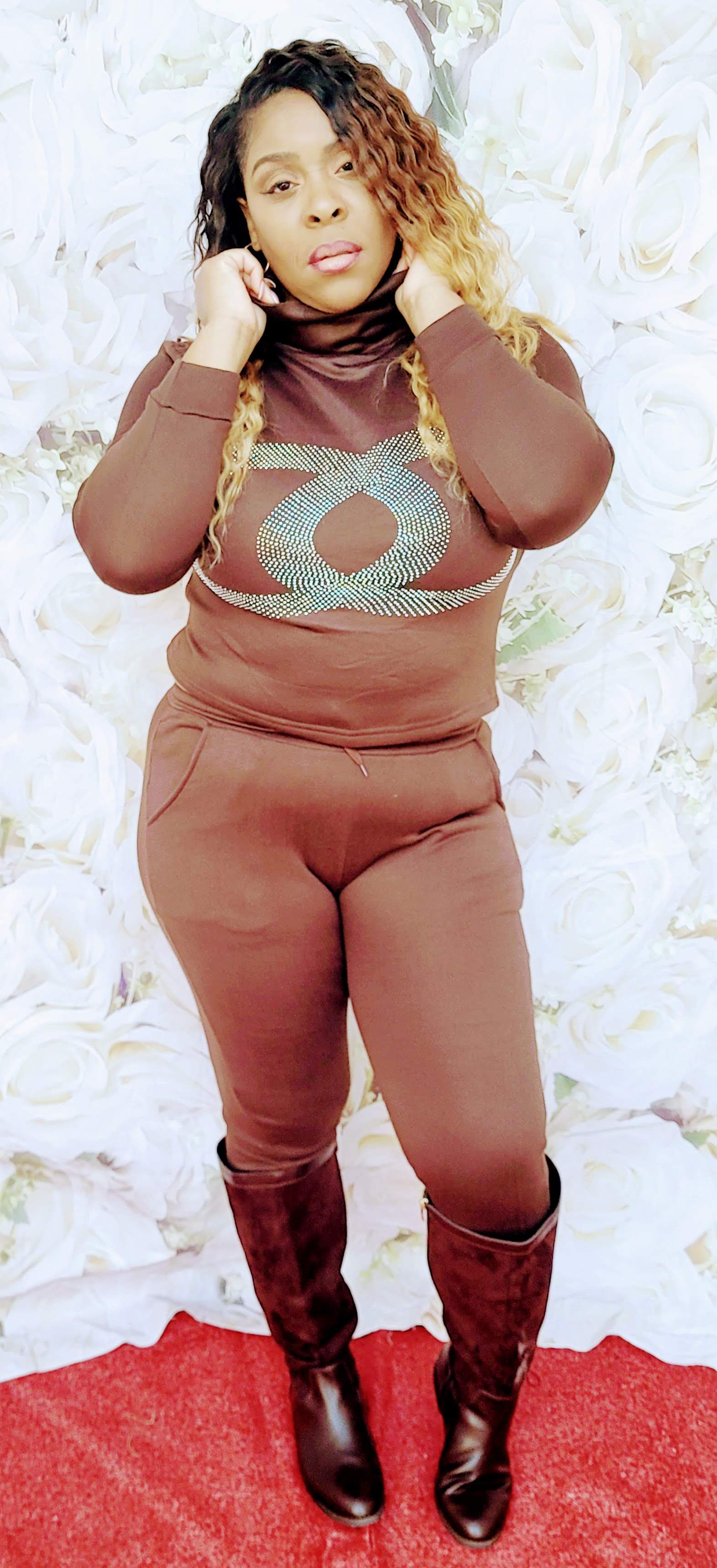 BROWN COZY CC RHINESTONES TURTLENECK SWEATSUIT