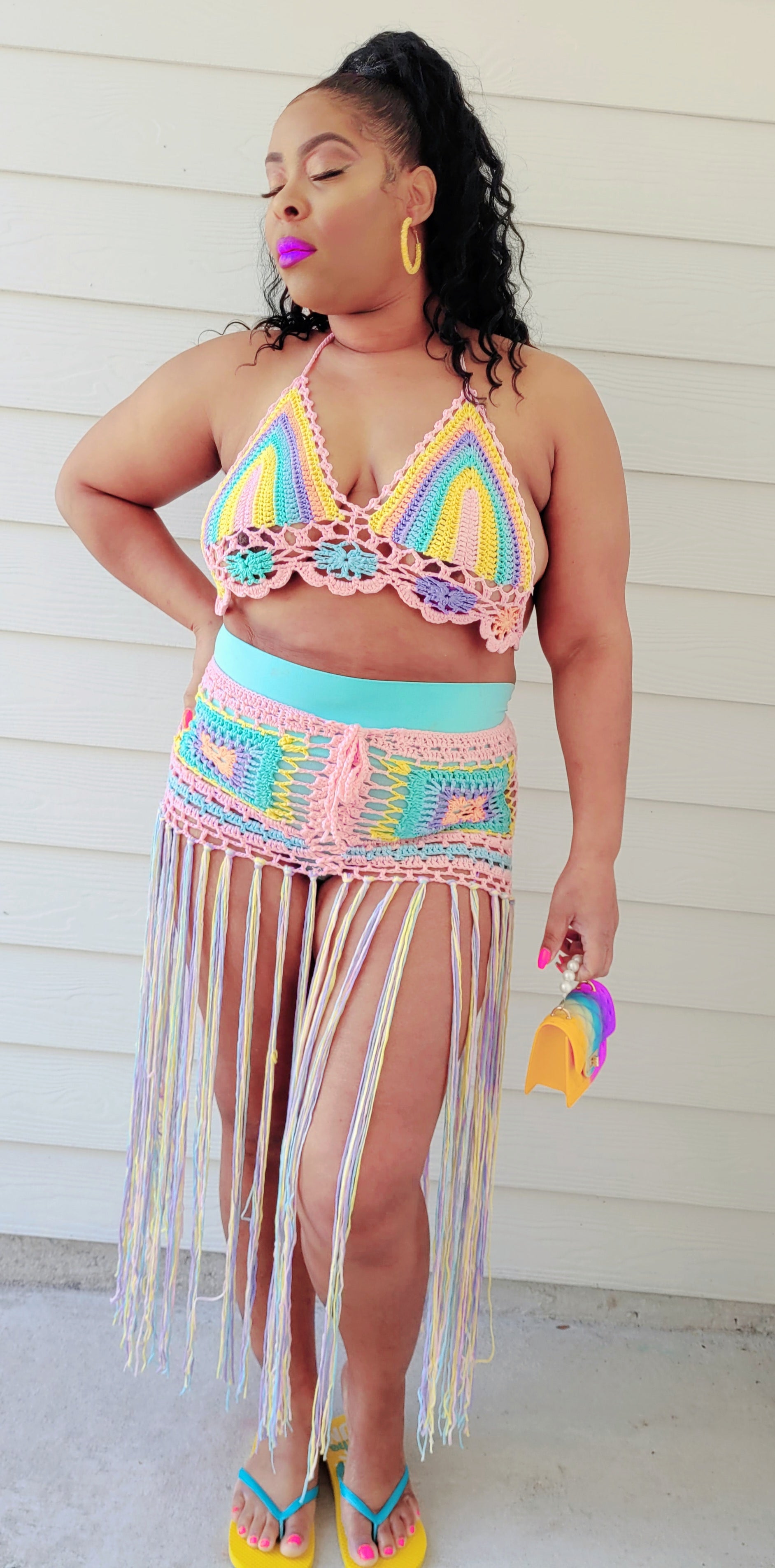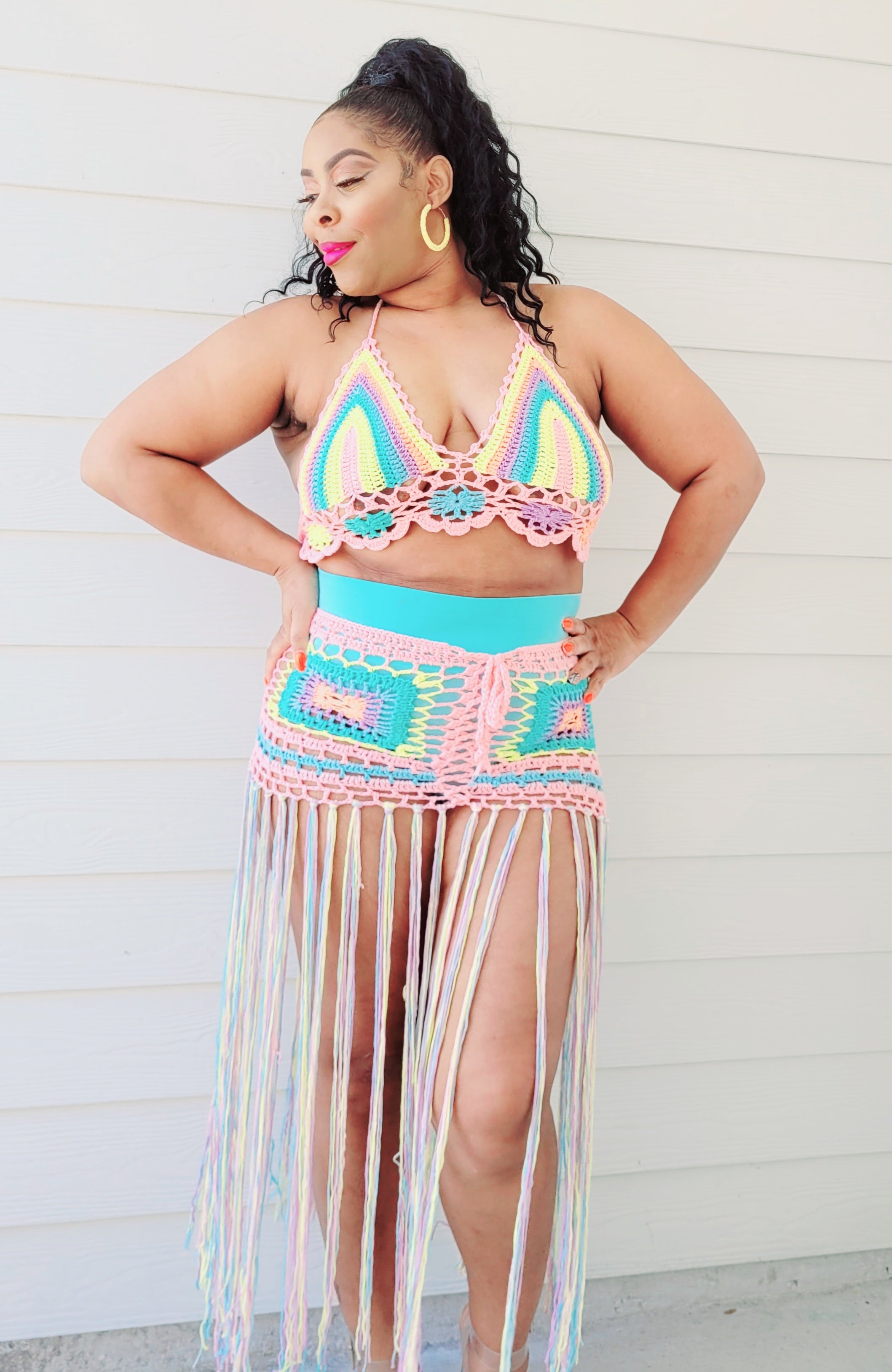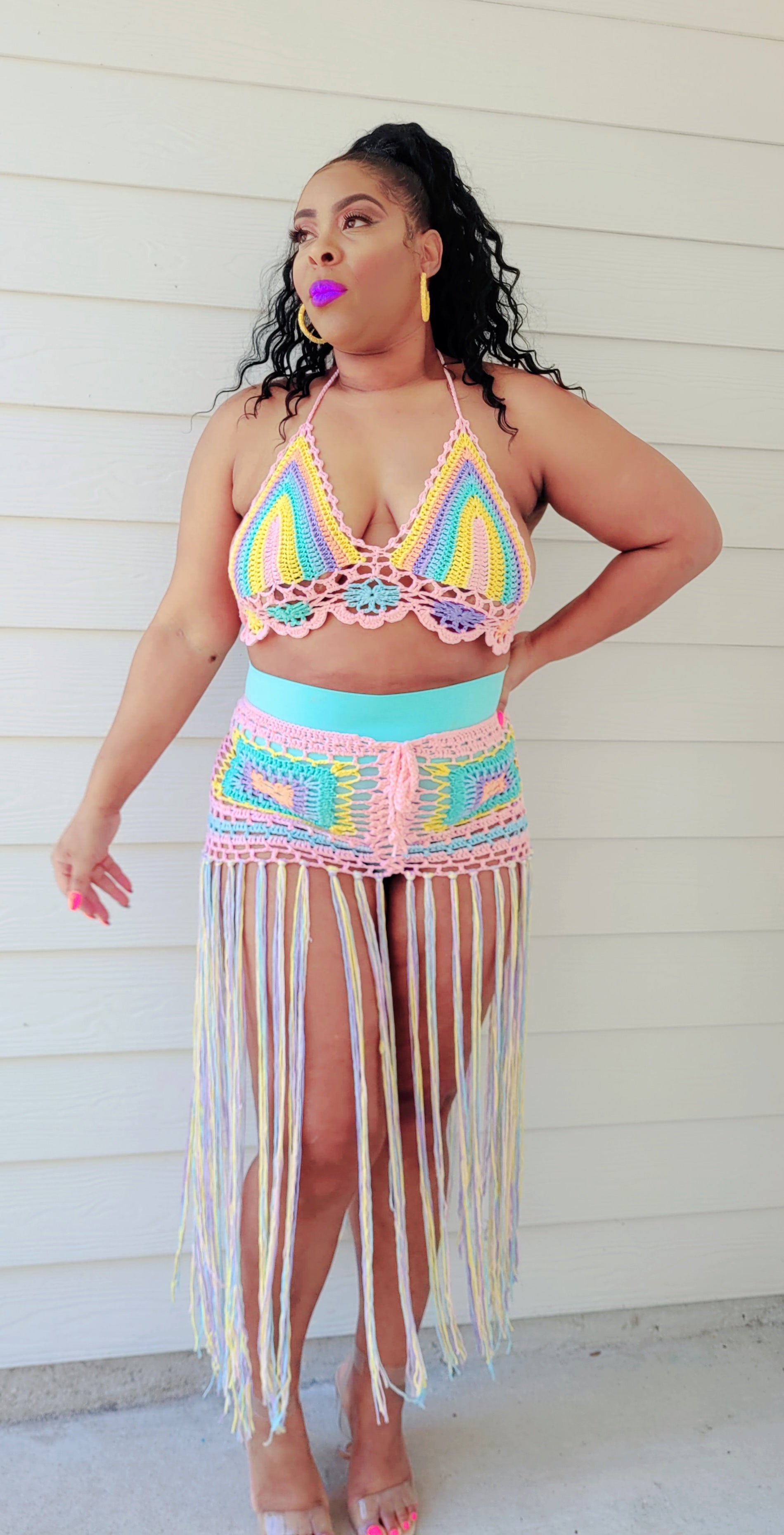 SEXY SIZZLING CROTCHET BRA AND SKIRT SET IN BABY PINK/YELLOW/MINT