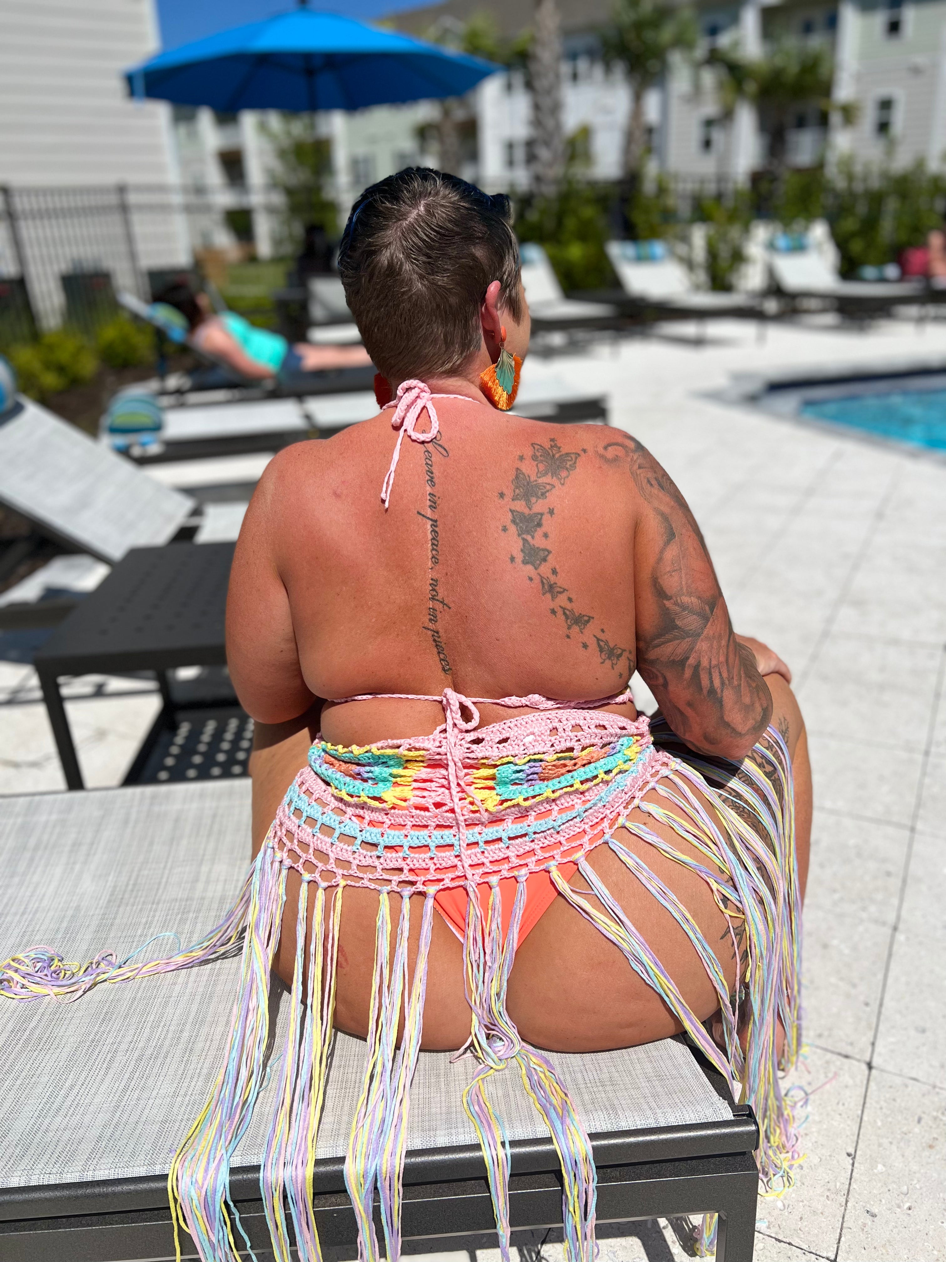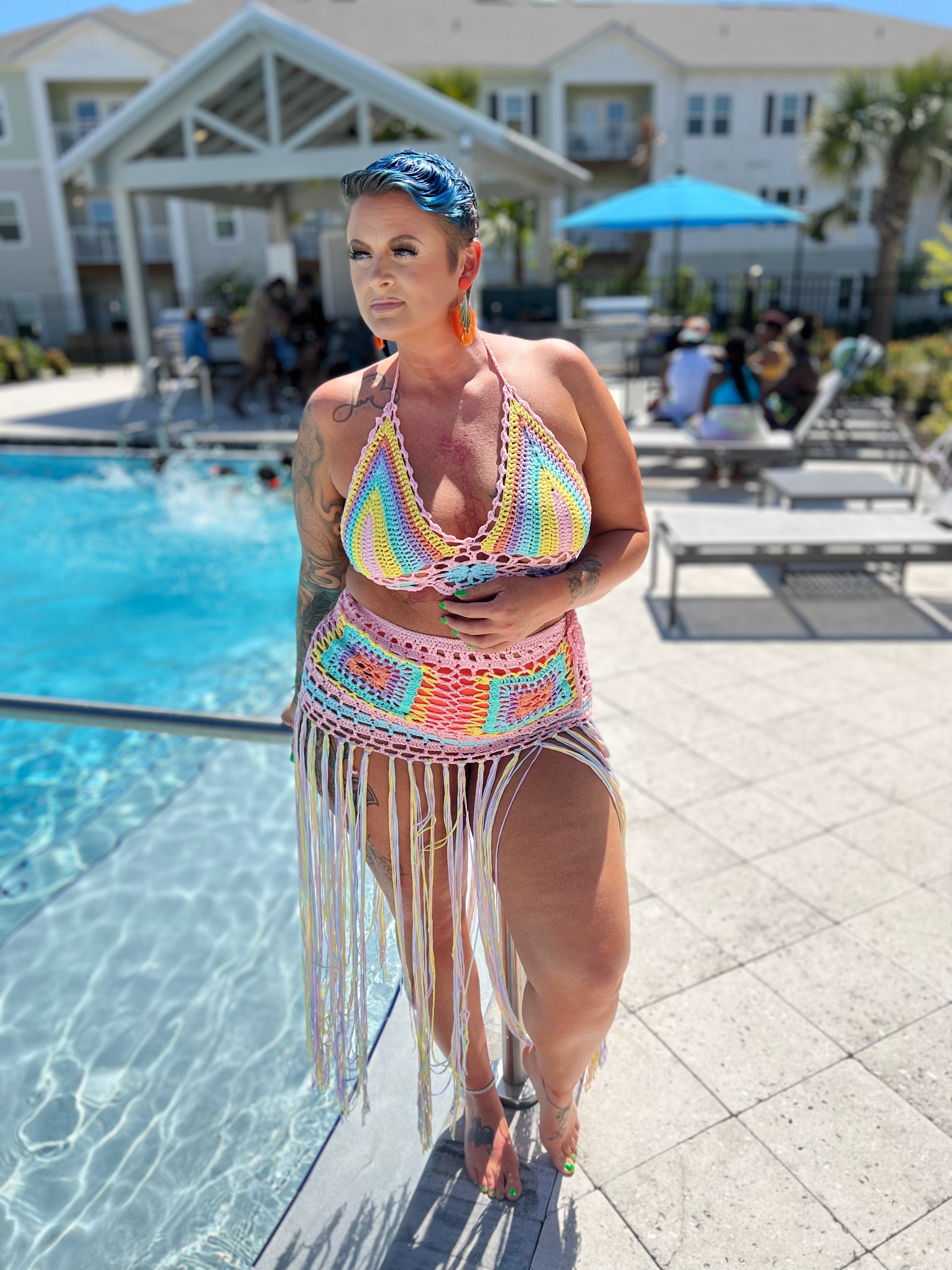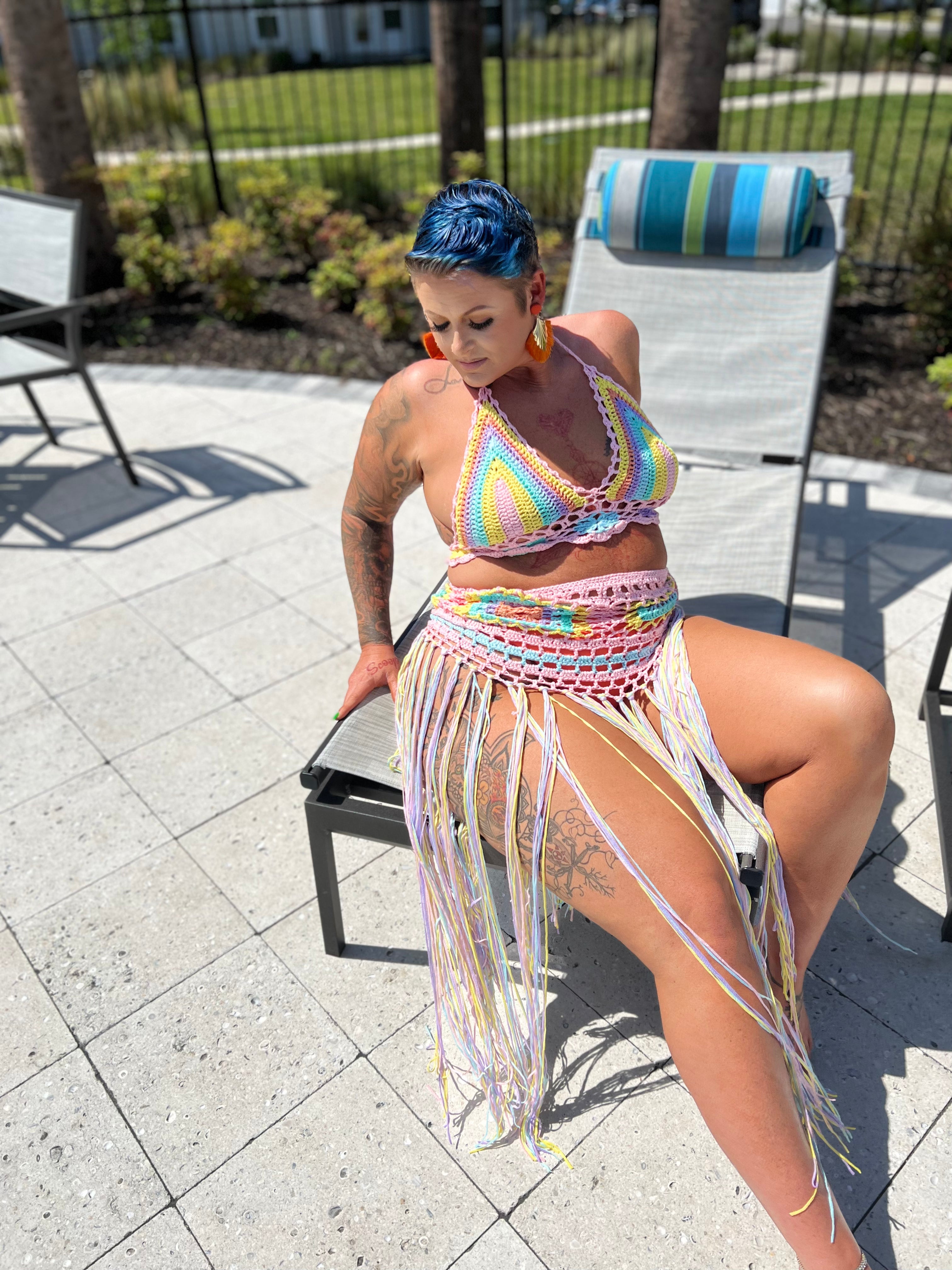 SEXY SIZZLING CROTCHET BRA AND SKIRT SET IN BABY PINK/YELLOW/MINT